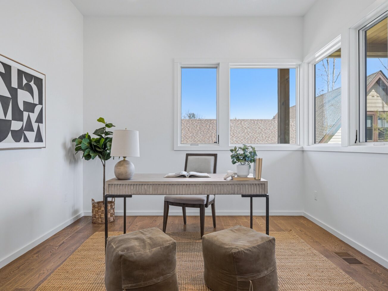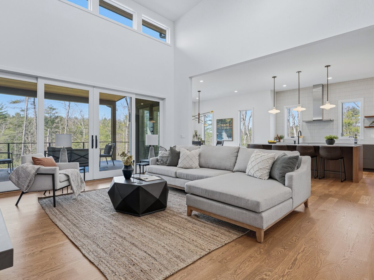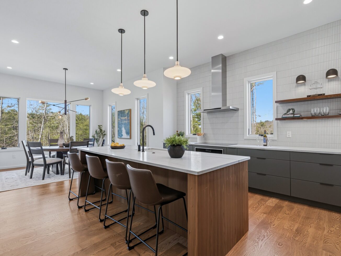 Contemporary new build with sleek mosaic stone and smooth vertical cedar siding, a stone foundation and topped with a standing seam metal roof. A steel frame and glass panel front door invite you into a hall leading to the main open spaces with an office on the right. Ultimate sleek kitchen with island, walk in pantry and GE Monogram appliances. 5″ select white oak flooring and tiled bathrooms throughout. Owners’ suite on the main level with a comfortable walk-in closet and a heated tile floor. Gather comfortably on the screened in porch, in the downstairs living room with wet bar and a wine cellar or outdoor patio. This site backs up to woods near the Blue Ridge Parkway for extensive wooded privacy. Enjoy miles of trails, parks, fitness center, saline pool, tennis, pickle ball and bocci. Estimated to be complete by the end of March.